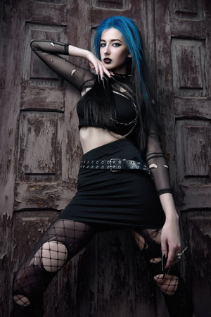 Outdoor portrait of seductive goth (deathrock) girl dressed in black skirt, holey blouse and pantyhose. Dark beauty