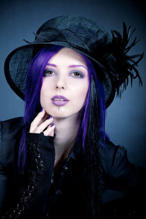 Close-up portrait of a beautiful hipster woman with piercings in the nose over grunge background. Beauty, make-up. Fashion. Gothic style.