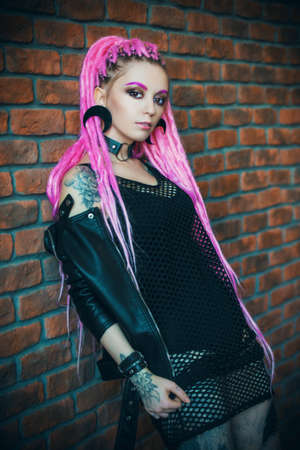 Sexy hipster girl with pink dreadlocks posing by the brick wall. Beauty, fashion.
