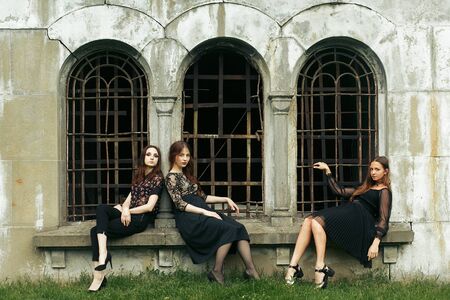 three gorgeous women in black sitting at old church in the city and posing, stylish gothic themed, ladies party