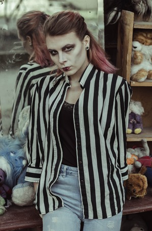 portrait of demonic makeup girl with vampire teeth. High quality photo