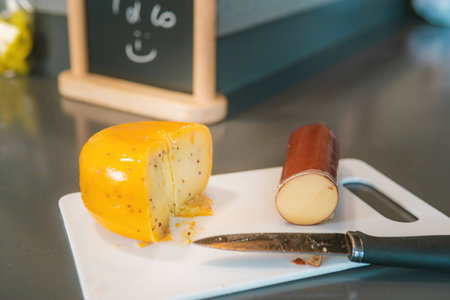 Close-up Cheese and sausage collection, slices of mature Dutch cheese made from cow's milk in the Netherlands.