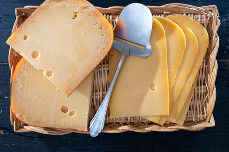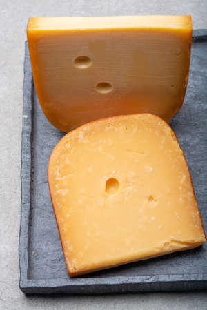 Cheese collection, Dutch ripe hard cheese made from cow milk in the Netherlands in piece and sliced close up