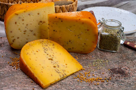 Cheese collection, pieces of hard yellow Dutch gouda cheese with dried caraway, mustard, cumin, fenugreek, pepper seeds close up