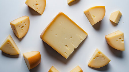 Several cheese pieces of different sizes and shapes are scattered on a white surface Perfect for culinary or food-related content.