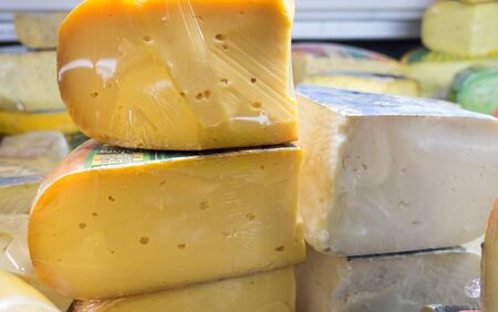 Cheese collection, old Dutch cheese with holes, made in the Netherlands close up