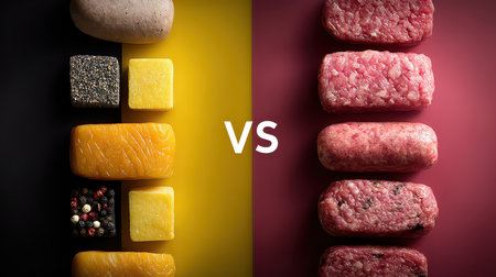 This vibrant image showcases a striking contrast between cheese and raw meat, ideal for culinary presentations and food-related projects.