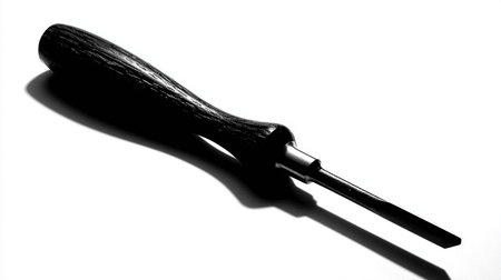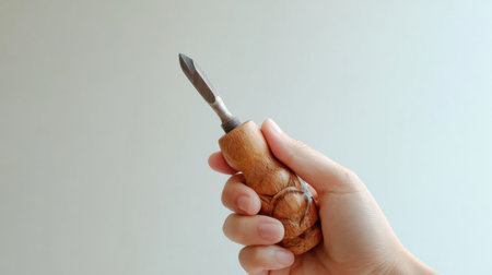 Wooden carving tool is being grasped firmly, showing its artistry and craftsmanship. The tools unique handle design stands out in a simple setting.