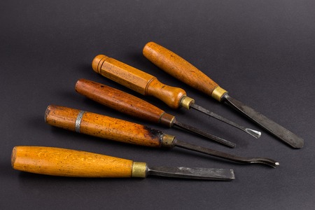 Old used wood lathe chisels selection on the dark wooden table, selective focus