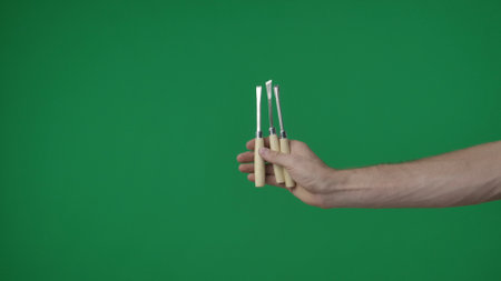In the frame on a green background, a chromakey male hand that holds, wood carving tools, they are different shapes, sharp. Depicts an advertisement. This could be your advertisement.