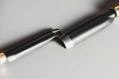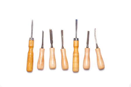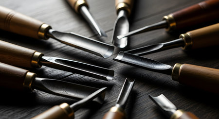 A row of beautifully crafted wood chisels rests on a wooden workbench, surrounded by shavings and sawdust. The image captures the essence of craftsmanship, showcasing the intricate details of each tool and the artistry involved in woodworking.