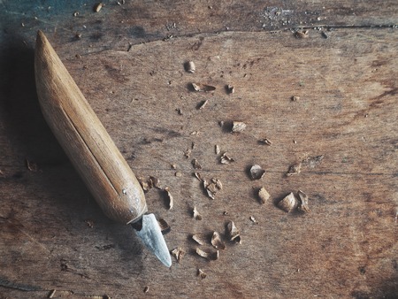 Wood carving tools arranged in an unorderly manner, carving wood in Thailand