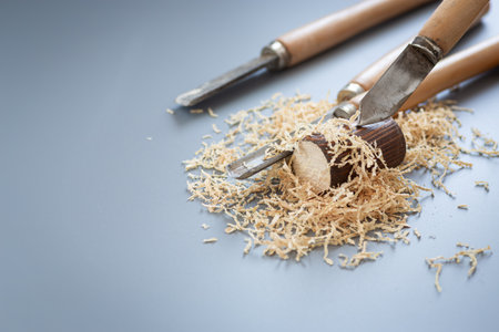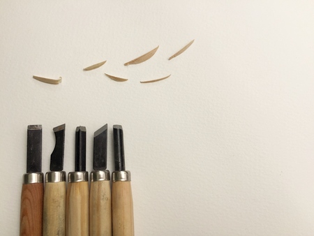 Chisels laid in wooden shavings on the desk. Carving tools lying in the shavings. In a carving workshop. Cutting of linden wood.