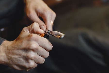The carpenter uses a chisel to handle the edges of the product. Toned image. close up view