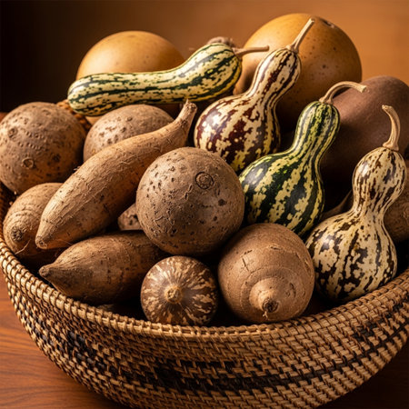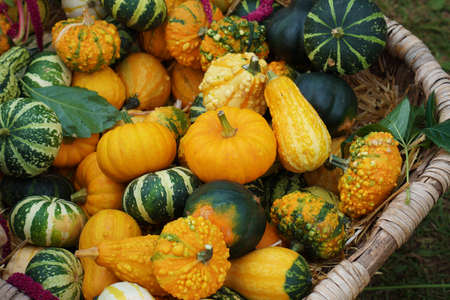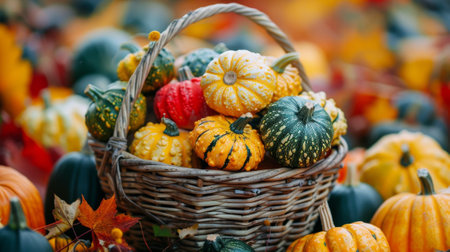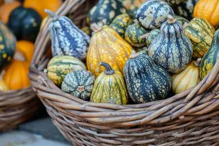 A vibrant array of decorative gourds and pumpkins arranged in wicker baskets at a local farmers market in autumn season