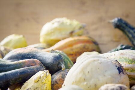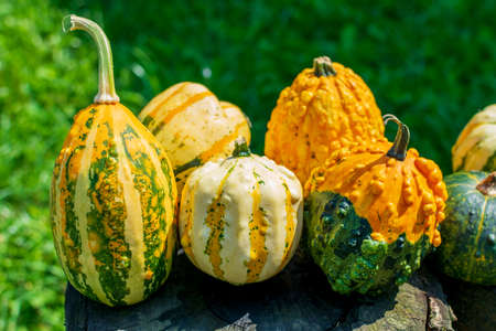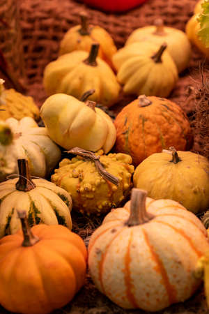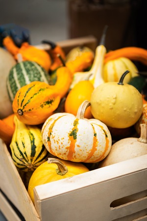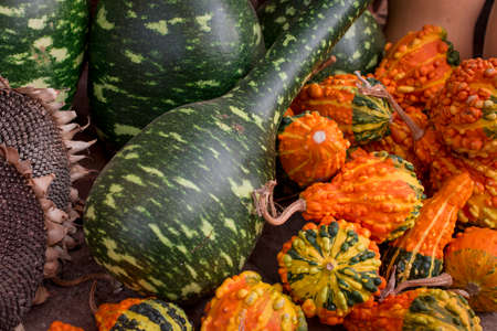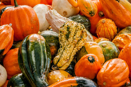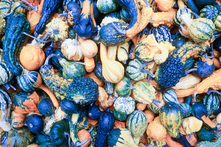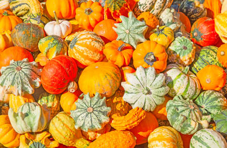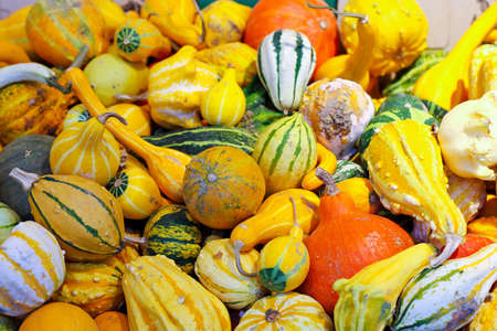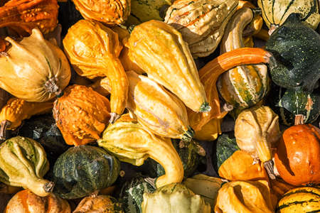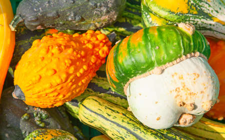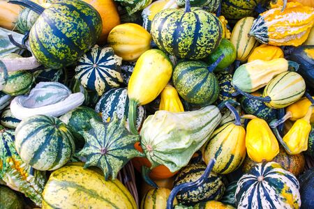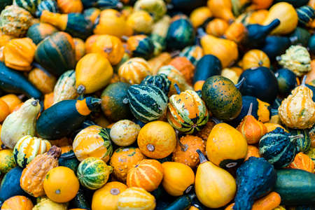 Variety of colorful ornamental pumpkins, gourds and squashes in the market, harvest and autumn concept