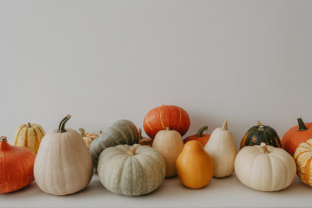 Minimalist fall background with various pumpkins set in a row, autumn concept with blank space for a text