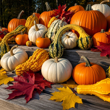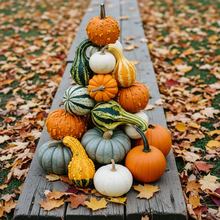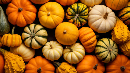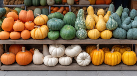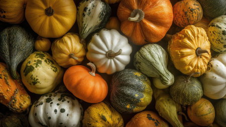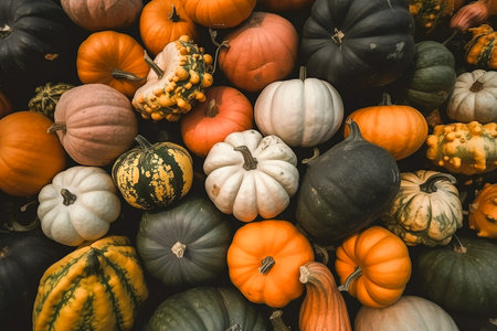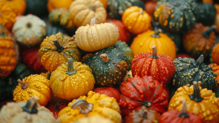 Thanksgiving and Harvest Festival. A variety of pumpkins, their vibrant colors and textures ranging from smooth orange to warty green, representing the diversity of nature's gifts.