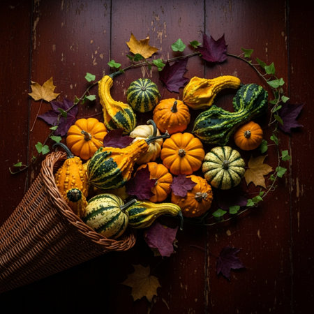 harvest cornucopia, a basket filled with a variety of vibrant gourds and zucchinis, symbolizing abundance and appreciation for the outdoor harvest on thanksgiving