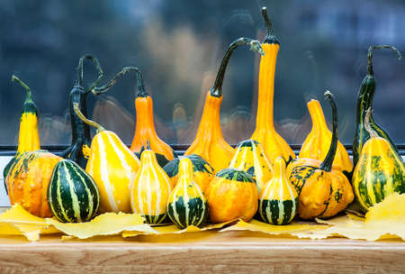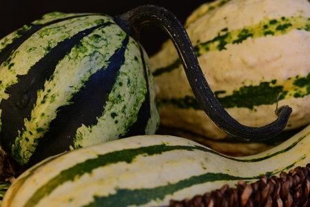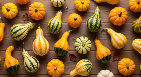 Row of decorative striped pumpkins on a farm counter matting, pumpkin indie rattle, harvest festival, horizontal beautiful halloween background