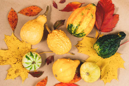 Cute Different kinds colorful mini pumpkins placed on stone background. Creative Top view flat lay autumn composition. With copy space for text