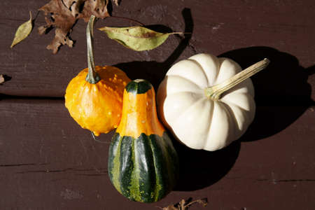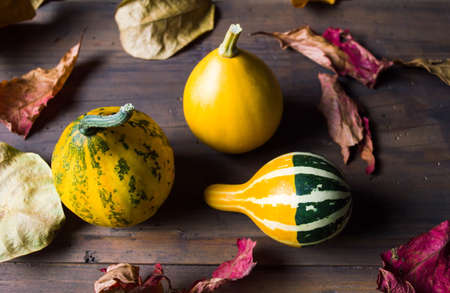 Colorful pumpkins and autumn leaves on rustic wooden background.