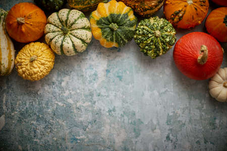 Autumn border arrangement of assorted pumpkins, Fall decor with copy space.