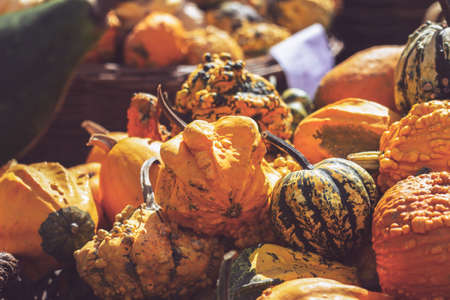 Many decorative pumpkins on display at the farmers market in France. Variety of ornamental pumpkins for sale. Harvesting and Thanksgiving concept