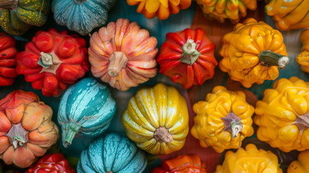 A collection of colorful ornamental gourds arranged in a vibrant pattern, showcasing a variety of shapes and colors, perfect for autumn and festive decoration.