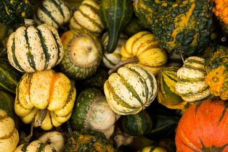 Pile of decorative mini pumpkins and gourds, on locale farmers market; autumn background