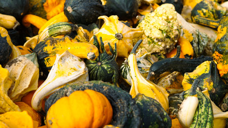 Fresh decorative gourds in assorted colors and shapes stacked in a pile, symbolizing autumn harvest, organic farming, seasonal vegetables and natural decorative food visuals.