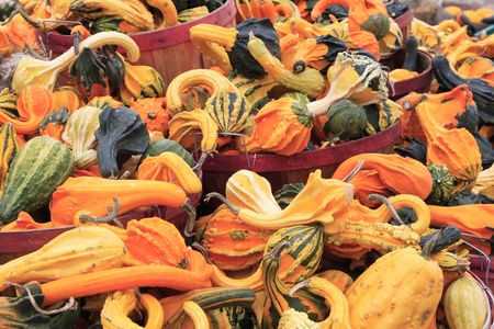 Colorful Autumn Gourds in baskets at a road side farm stand market