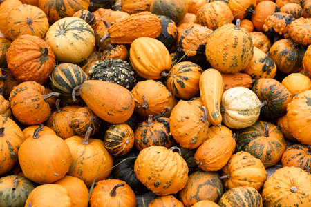Pumpkins in different shapes and sizes, Diverse assortment of pumpkins, decorative pumpkins, pile of cute pumpkins in different colors at pumpkin patch in a local farm, seasonal display