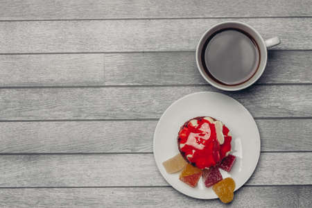 Mans pouring custard cream Into fruit cake with cup of coffee on table.