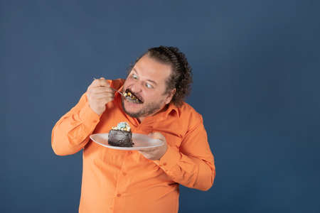 Funny fat man in orange shirt with a piece of chocolate cake on a plate. Birthday celebration