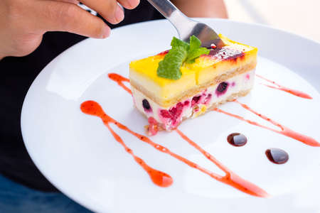 Three berries cheesecake style on white plate with hand use the fork to eat