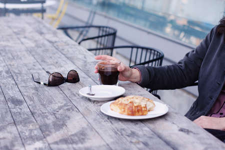 Closeup of kids child hand trying to steal tasty cakes from plate on tray. Impatient person taking food dessert on dish. Tasty delicious pastry with coffee cup in cafeteria cafe.