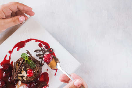 Tasting of chocolate cake with cherry jam, decorated by sweet red berry, almond and mint. Delicious dessert serving in restaurant, close up picture with free space on white background