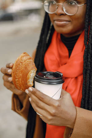 Enjoying morning routine beautiful millennial woman eating delicious brownie and drinking coffee
