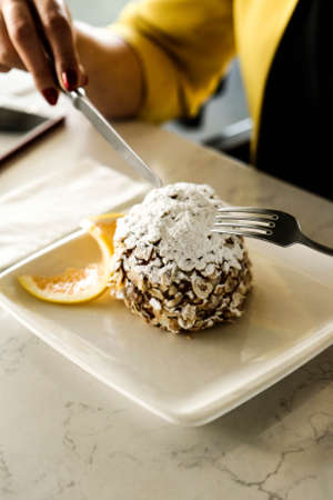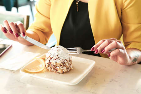 Woman eating dessert with creme brulee at the restaurant outdoors. Concept of italian cuisine