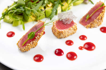 beautiful food: steak tuna in sesame, lime and fresh salad close-up on a plate on the table