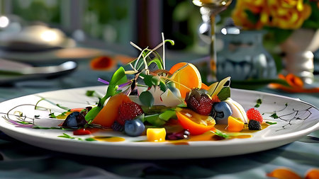 A beautifully presented fine dining plate showcasing fresh ingredients, vibrant colors, and artistic decoration, perfect for gourmet culinary appeal.