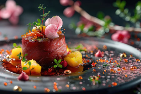 Culinary art is a harmonious combination of fresh ingredients of the highest quality. The elegant fusion showcases the chef's attention to detail. The background is softly blurred, drawing attention to the culinary masterpiece in the foreground.