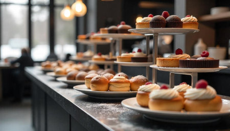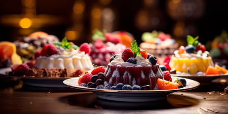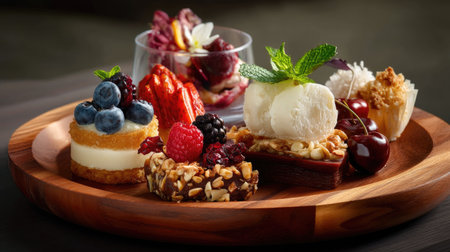 A beautiful arrangement of assorted gourmet desserts showcases vibrant colors and rich flavors. Indulge in a delightful plate featuring cakes, creamy ice cream, and fresh berries, perfect for celebrations or special occasions.