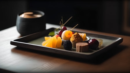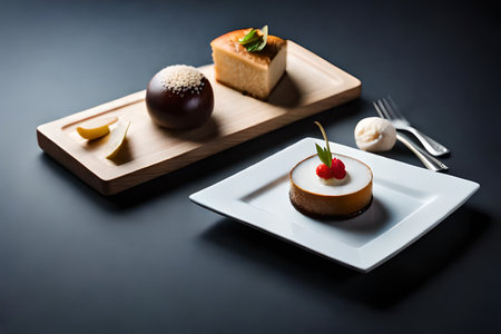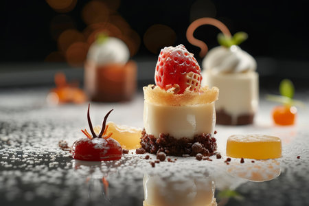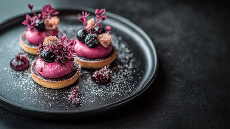 A vibrant display of mini desserts topped with fresh fruits and cream, elegantly presented on a stylish plate, perfect for a culinary showcase.