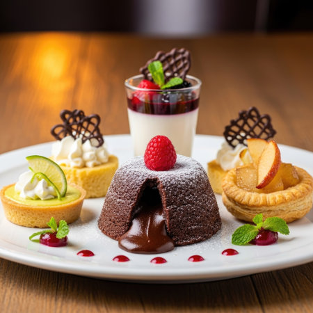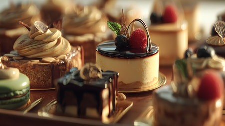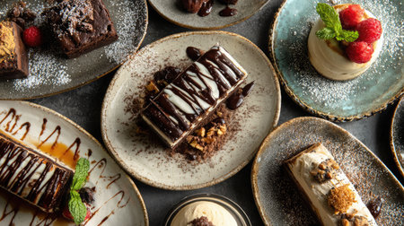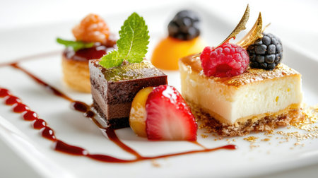 A visually appealing arrangement of assorted gourmet desserts featuring rich chocolate, creamy cheesecake, and fresh berries, perfect for fine dining.
