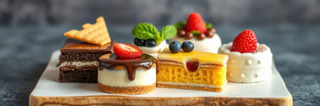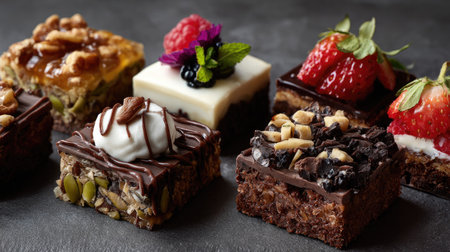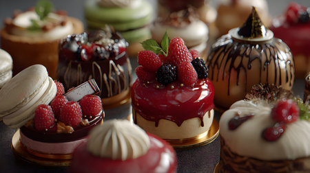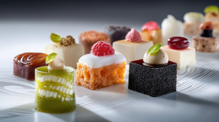 A beautifully arranged selection of artistic miniature desserts, showcasing vibrant colors, intricate designs, and delectable flavors, ideal for parties, celebrations, and culinary events.