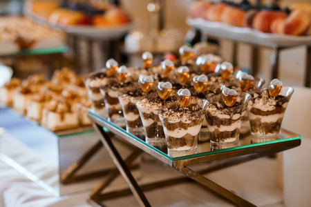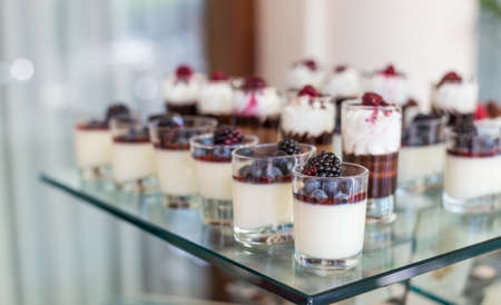 Delicious chocolate and berry desserts in shot glasses on buffet table. Catering concept