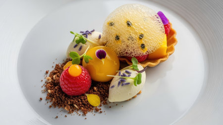 An overhead view reveals a meticulously crafted dessert, showcasing various fruits and elements artistically arranged on a white plate. The composition features vibrant colors, textures, and shapes. The lighting highlights the fine details, suggesting a high-end culinary presentation. This image could be used for restaurant menus or food-related publications.