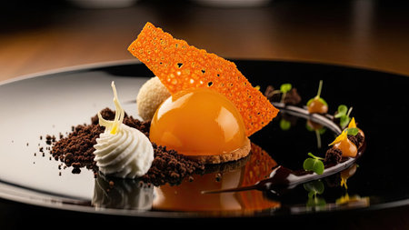 Vividly decorated pastries with intricate toppings are placed on a sleek black plate, creating a striking visual contrast against the dark setting.